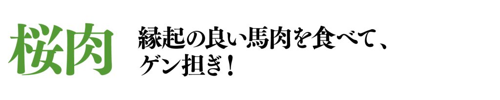 ![]() 桜肉三貫盛り 【3貫】1,230円(税込:1,353円) ●山わさび ●芽ネギと柚子塩 ●炙りブラックペッパー |