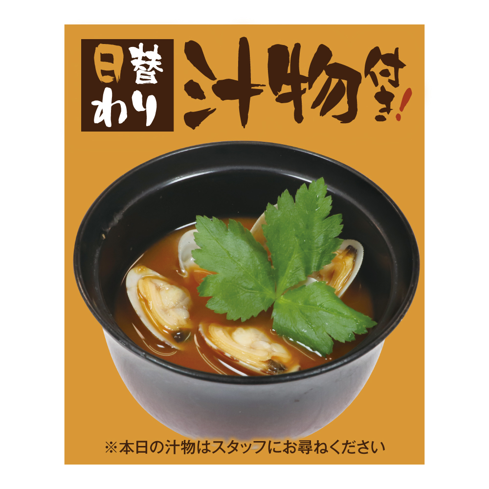 ![]() 全てのランチメニューに 日替わり汁物付き! ※本日の汁物は スタッフに お尋ねください |