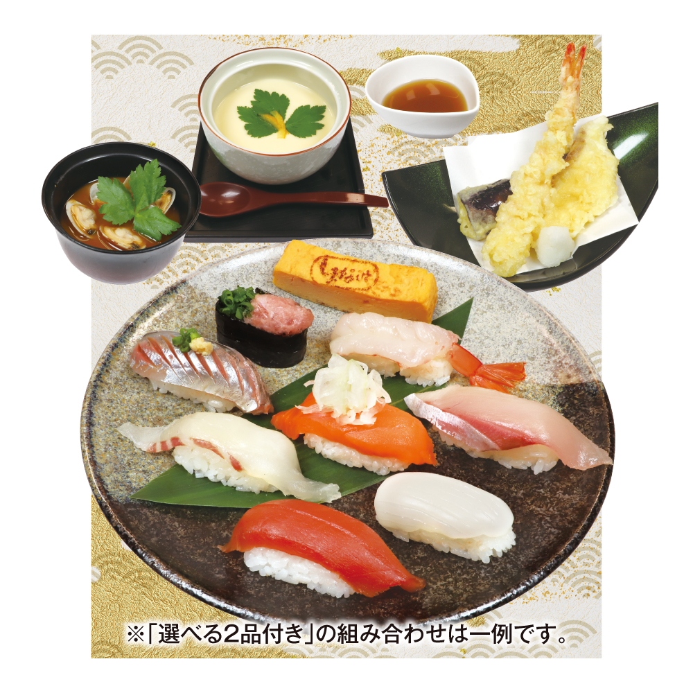 ※仕入れ状況により、ネタ・汁物・デザートは日によって変更となる場合がございます。